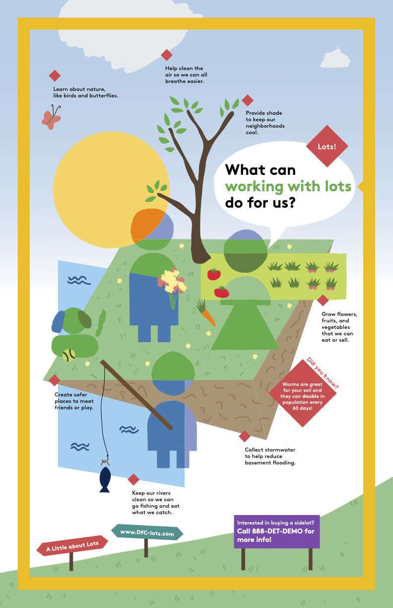 In 2015, Detroit faced a significant challenge: nearly 40 square miles of open, structure-free land, a result of the rapid demolition of vacant structures, sprawled across the city. Recognizing the need for a creative and thoughtful approach to land stewardship, local think tank Detroit Future City partnered with the Work Department to develop a solution. Together, we envisioned an accessible, practical tool to empower property owners and residents to transform vacant lots into vibrant community assets. Our shared goal was to make it easier for residents to implement environmentally friendly, site-specific green infrastructure that would benefit both the land and the surrounding neighborhoods while being simple to maintain.