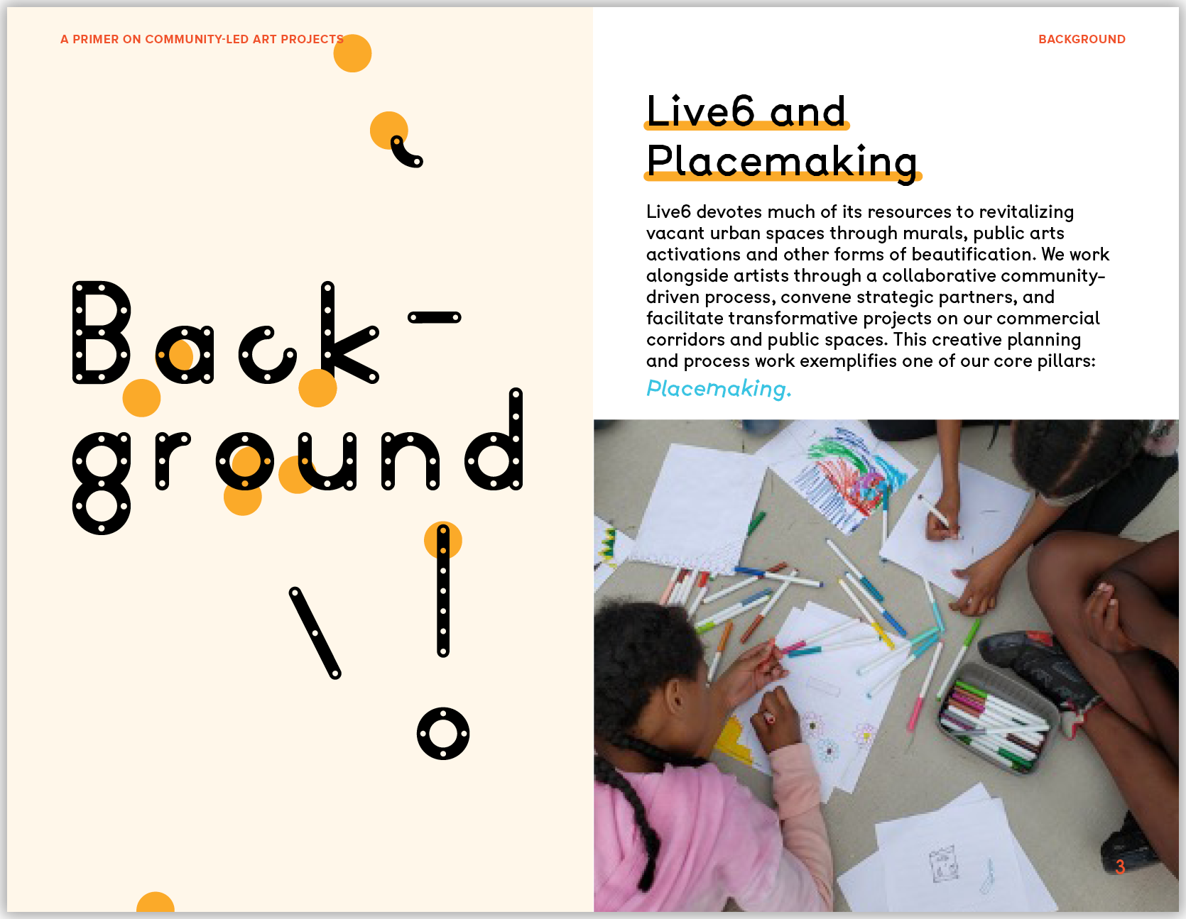 Design to help communities plan and sustain public art projects.Live6 Alliance is a community development organization that works to increase opportunity and enhance quality of life in Northwest Detroit. In 2017, the organization launched its Detroit Neighborhood Arts Project to beautify and uplift retail vital corridors. For five years, they worked closely with community members and artists to produce seven murals and public art projects throughout the community. As the project began to wind down, Live6 sought to document its collaborative approach and provide a resource that residents, artists, institutions, and community organizations could use to inform future community-led public art projects.